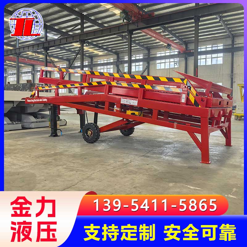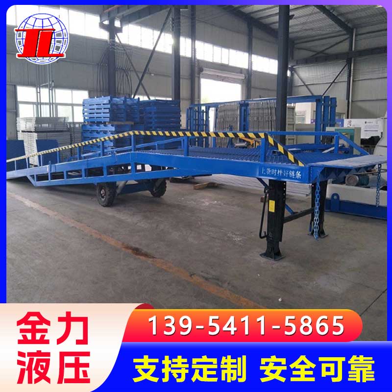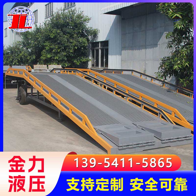 移动登车桥是与叉车配合使用的货物装卸辅助设备,可根据货车车厢不同高度调节,实现货物的快速装卸。